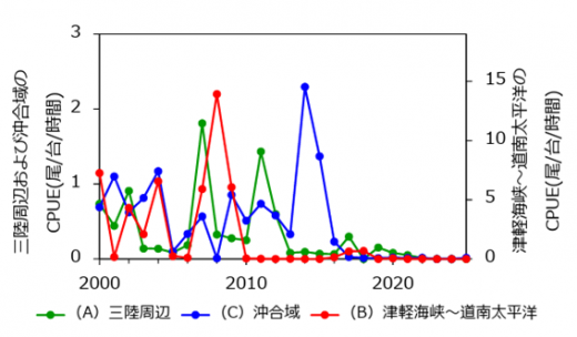 資源は回復していないように見えるのに、なぜ豊漁なのでしょうか。恐らく、「豊漁」の定義に問題があるのだと思います。今年の漁獲が多いのは太平洋北部の一部の漁場のみです。日本海などそれ以外の漁場は、例年並みかそれを下回っています。また、漁獲量が増えている北太平洋漁場の漁獲にしても、資源が激減した近年の中では多かったと言うだけで、資源が豊富だった時代と比較すると、低水準にとどまっています。