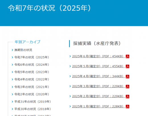 では、漁獲量はどれぐらい増えたのでしょうか。実は水揚げデータは公開されていません。水産庁のサイト(資源管理の部屋)には、漁獲量の状況(毎月更新)へのリンクがあります。リンク先は、水産庁外郭団体の漁業情報サービスセンター(https://www.jafic.or.jp/business/eez/tac/2025/)です。採捕実績をみると、6月までのデータしか公開されていません。つまり、スルメイカが現在までどれぐらい漁獲されたかという情報が公開されていないのです。基礎的な情報が無いので、枠を増やすことの妥当性の検証が難しくなっています。素早く漁獲枠を増やす前に、漁獲量の集計と公開を迅速にすべきではないでしょうか。