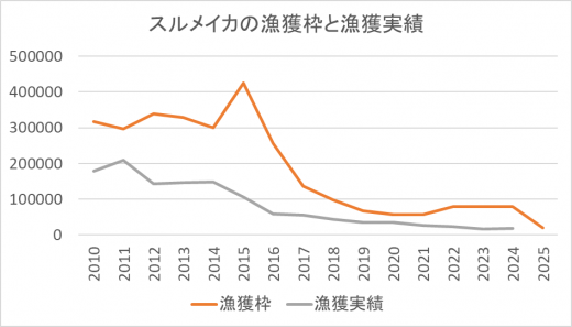 スルメイカの漁獲枠と漁獲実績(農水省統計より筆者作成)