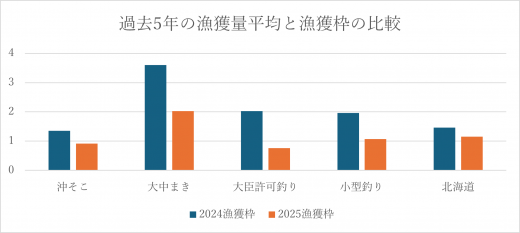漁業種別の漁獲枠の現状を理解するために、過去5年の漁獲実績と2024年と2025年の漁獲枠を比較してみました。2024年は全ての漁業種において1を上回っています。つまり、実漁獲よりも多い漁獲枠が設定されていたことになります。2025年は全ての漁業種で漁獲枠が大幅に削減されています。沖底と大臣許可イカ釣りの漁獲枠は、過去5年の漁獲量の平均値よりも漁獲枠が低くなっています。また、小型釣りと北海道も過去の平均値をやや上回るレベルなので、何も考えずに漁獲をすると枠を超過する可能性があります。