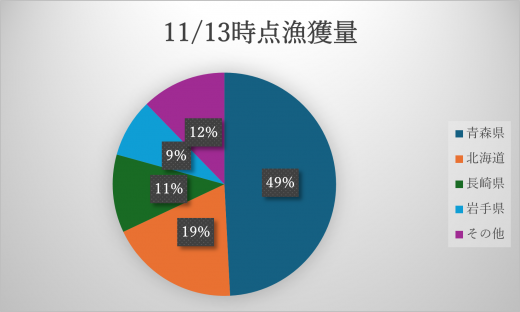 小型イカ釣り漁業の都道府県別の漁獲量が水産庁により公開されています。この図を見ればわかるように、全国的に獲れているのではなく、青森県の漁業者がほぼ単独で枠を使い果たしていることがわかります。当初の漁獲枠が2800トンなのに、青森県に所属する小型イカ釣り漁船が、11/13時点で、3824トンも漁獲をしています。漁獲枠を守る気が微塵もなくて、潔いですね。10/24時点から11/13時点まで、ほとんどの都道府県で漁獲が停止する中で、青森県だけが1225トンも漁獲をしています。それに次いで北海道も獲っているのですが、北海道は道の沿岸漁業の漁獲枠をイカ釣り漁業に融通しているので、全体として漁獲枠を守っているようです。スルメイカの漁獲枠超過問題は、青森県の小型イカ釣り漁業の問題と言えそうです。