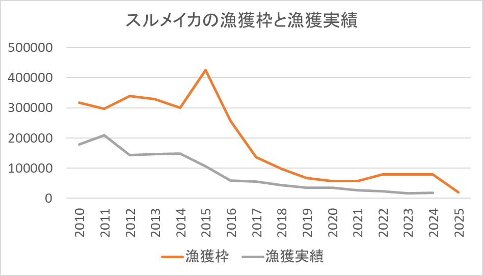 スルメイカの漁獲枠と漁獲実績(農水省統計より筆者作成)